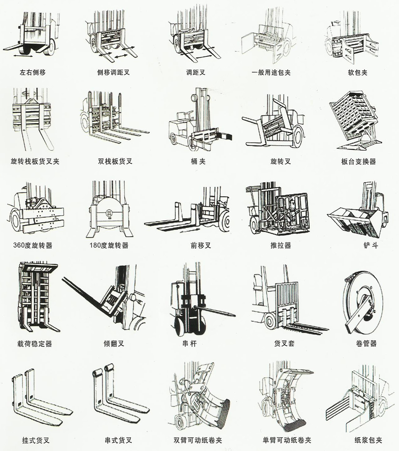 南京叉車提示您:叉車屬具是在叉車的貨叉架上增設或替代貨叉進行多種作業的承載裝置。叉車除使用貨叉作為基本的承載裝置外,還可以配用各種形式的可拆換屬具進行作業。這就擴大了叉車的使用范圍,提高了叉車的作業效率。目前各種屬具已達30多種,以下為常用的屬具。