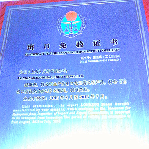 今年2014龍工叉車憑借多年努力,不斷技術創新,追隨的潮流。終于在2014年獲得“出口免驗證書”。此次獲得“出口免驗證書”,證明了龍工多年來的經營策略的正確性,以及龍工叉車整體研發能力的提高,叉車質量水平得到提升,已經被市場用戶所認可,另一方面說明國產叉車以其良好的性價比優勢在競爭中已具備一定的市場競爭力。