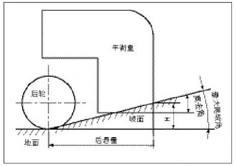 內燃叉車平衡重下端的離去角也很重要,該角度主要是為了避免上、下坡時平衡重下端與地面摩擦,理論上離去角與具體車型的大爬坡角相等。平衡重下端切除點的位置要根據具體車型的大爬坡度、平衡重的后懸量來確定。本文以爬坡度20%、平衡重后懸量715 mm進行計算,如圖所示。平衡重外側離地高度H計算公式如下: