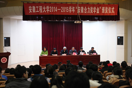 安徽工程大學(xué)舉行2014—2015學(xué)年“安徽合力獎學(xué)金”頒獎典禮,蕪湖合力叉車董事長張德進(jìn),安徽工程大學(xué)黨委書記陳其工、校長劉寧、副校長李震等相關(guān)領(lǐng)導(dǎo)共同出席典禮。