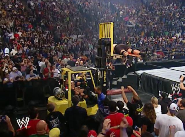 這是發(fā)生在2003年布洛克對陣大秀哥的比賽,完整比賽沒找到,但全程大的亮點就是布洛克開著個蕪湖叉車來到擂臺,打到了大秀哥,然后把大秀哥像貨物一下拉上蕪湖叉車給拉走,全程動作相當利索,好無尿點。比起現(xiàn)在的比賽,那時WWE用到的道具可是五花八門,爆點十足!