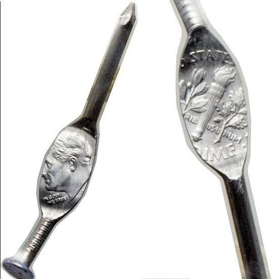 這枚硬幣被錯印在被壓扁的釘子上面,硬幣正面是羅斯福總統的面孔,配上文字“我們相信上帝”(In God We Trust),背面是一把火炬。經錢幣評級公司鑒定,其等級高于一般錢幣。硬幣上沒有標記年份,但相關人士推斷,該幣鑄于2000年或更早一些。