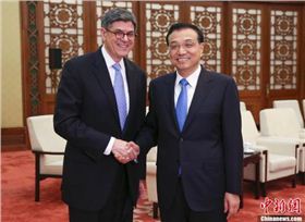 3月30日,中國國務院總理李克強在北京人民大會堂會見美國總統特別代表、財政部長雅各布·盧。中新社發劉震攝
