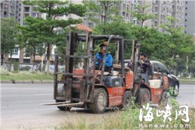 昨日上午10時許,莆田市區荔園西路上出現險象環生的一幕,一輛馬鞍山叉車搭載著另一輛馬鞍山叉車,在機動車道上一路“倒行”。