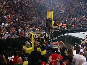 這是發生在2003年布洛克對陣大秀哥的比賽,完整比賽沒找到,但全程大的亮點就是布洛克開著個蕪湖叉車來到擂臺,打到了大秀哥,然后把大秀哥像貨物一下拉上蕪湖叉車給拉走,全程動作相當利索,好無尿點。比起現在的比賽,那時WWE用到的道具可是五花八門,爆點十足!
