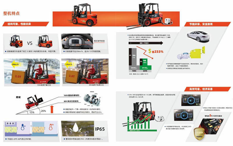 1、龍工油改電叉車(chē)(龍工鋰電池叉車(chē))綠色環(huán)保,零排放,低噪音,比柴油車(chē)環(huán)保性能和指標(biāo)均好;